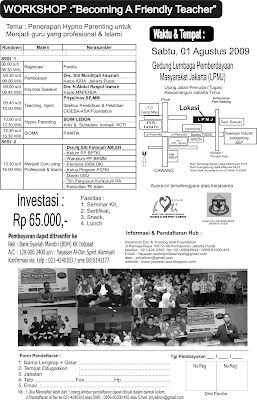 Untuk itu, jikalau anda ingin mengetahui tip & tehnik menjadi guru yang bersahabat, maka ikutilah : WORKSHOP "Becoming A Friendly Teacher" hari sabtu, 01 Agustus 09 di LPMJ Jakarta pk.08.00 - 16.00 wib